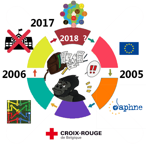 La première version du jeu « CHAHUT » a été subventionnée en 2005 par le Programme Daphné de la Commission européenne et distribuée dans les écoles primaires à travers l’Europe grâce au Département International de la Croix-Rouge de Belgique afin d’enclencher le pas vers la prévention au harcèlement scolaire.